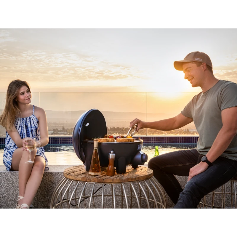 The E Braai comes with an accessory stand, a BBQ grid with GreenGrill ceramic coating and a dome. For even more possibilities, a paella pan and pizza stone are available as optional accessories