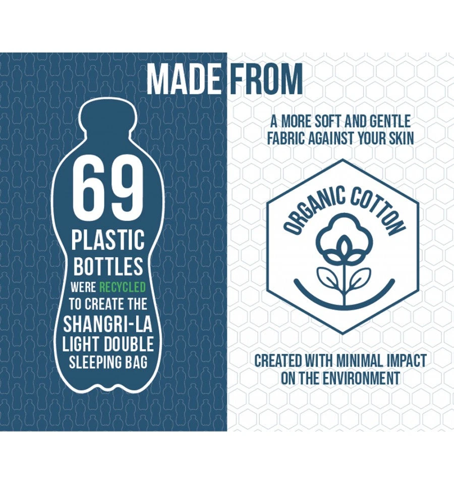 The Vango Shangri-La Collection has expanded into this beautiful new range of luxury sleeping bags to complement our award-winning Shangri-la mats for the ultimate night’s sleep. As part of our Earth Collection, the bag has been made using organic cotton and 100% recycled fill, making it a more sustainable choice. This square shaped, double sleeping bag with integrated headrest provides the extra space and comfort you need for the perfect sleep and the organic cotton is hypo-allergenic and feels soft on your skin, much like your bedding at home and being cotton, keeps you cool and comfortable on a hot summers night. One of the unique features about this back is its versatility as the bag can be separated fully to form two individual bags or two blankets. It’s also machine washable at 30 degrees and comes in a compression carry bag for a smaller pack size and for easy storage. Sleep like royalty on your camping or campervan trips and use for everyday use when you have family of friends over to stay.